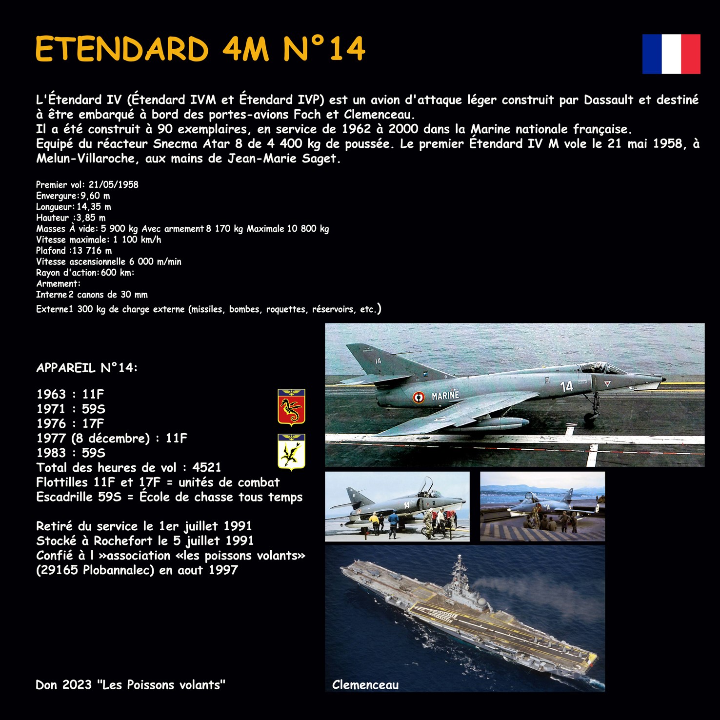 Etendard IV M Etendard IV M n°14 après restauration (30/08/2023) Arrivée de l’Etendard IV M n°14 au MAM le 14/04/2023 (en savoir plus sur le Dassault Étendard IV ) Haut de page